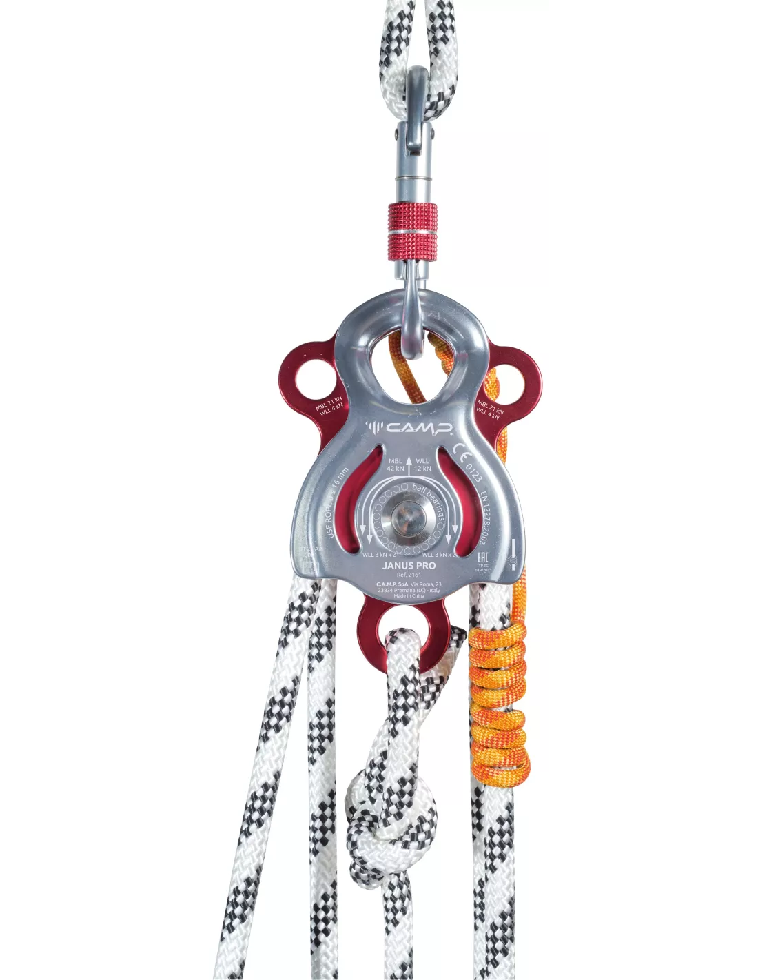 A high strength multifunctional double pulley for block-and-tackle systems and complex operations. Features large wheels, a main attachment point that accommodates three carabiners, and a large becket with a large bottom attachment point and two secondary attachment points on the sides for linking, positioning and attaching progress capture systems. For use with ropes up to 16 mm. Prusik minding, the self-locking knot can be installed on both sides of both wheels. Self-lubricated bushings are sufficient for light applications at low speed. Efficiency: 90%. Aluminum alloy body and wheels, stainless steel axle.